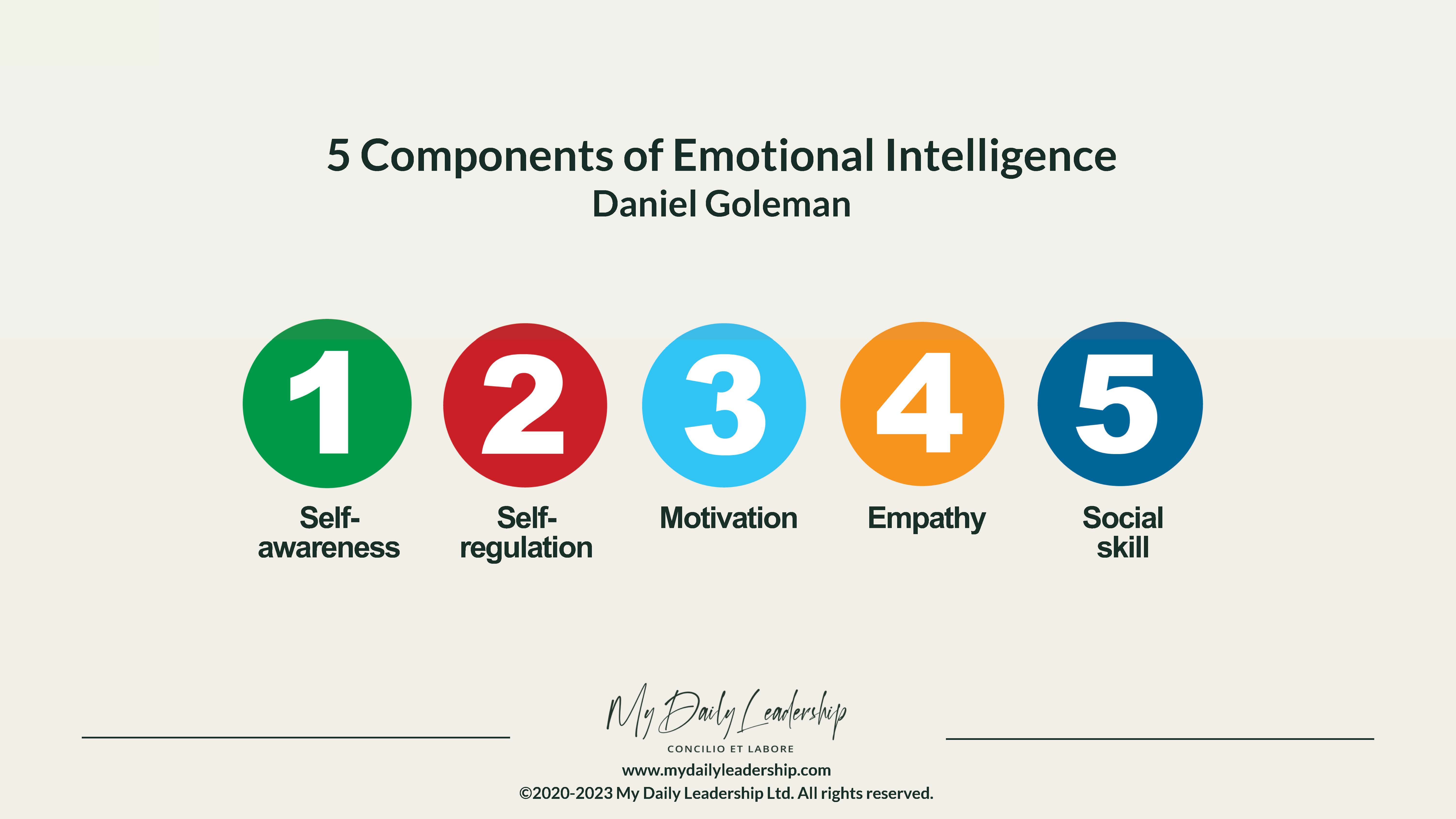 At My Daily Leadership, we use Daniel Goleman’s Emotional Intelligence framework as the foundation for developing emotionally intelligent leaders. These five elements are essential to building a leadership mindset rooted in emotional intelligence: